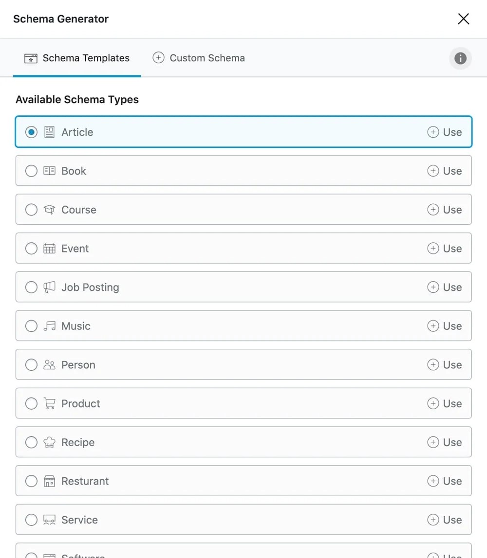 How to Use It: To get started, navigate to the Rank Math SEO dashboard. Next, select ‘Titles & Meta,’ then choose a post type. After that, select ‘Schema Generator.’ Here, you can choose from various schema types, such as Articles, Products, Recipes, and more, allowing you to customize how your content appears in search results.